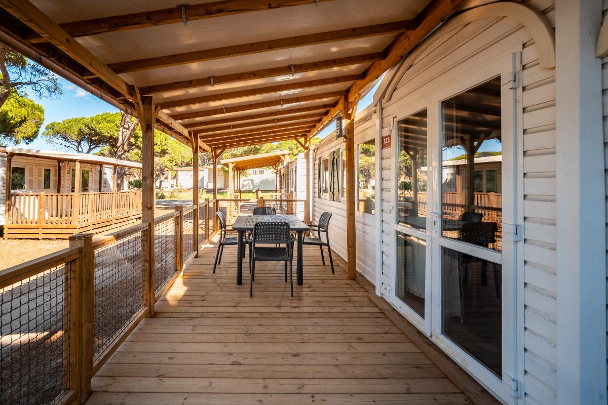 Sono composte ampia zona giorno da mq 17,5 con divano e angolo cottura, frigorifero (160L) con freezer (30l), forno a microonde, camera matrimoniale con accesso diretto al bagno, due camere con 2 letti singoli 80x190, bagno con box doccia e lavabo, toilette separata. Aria condizionata.Veranda esterna in legnocoperta, tavolo e sedie.